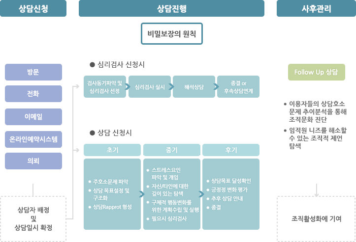 만약 자신의 회사가 어떤 목적과 방향으로 기업상담을 활용할 것인지에 대한 분명한 입장을 갖고 출발하지 않으면 회사에서 원하는 기업상담실의 모형과 상담전문가가 추구하는 상담실 모형이 달라 일관성 있고 안정감 있는 상담실을 유지해 나가기 어렵고 운영결과에 대해 만족감을 갖기도 어렵습니다.